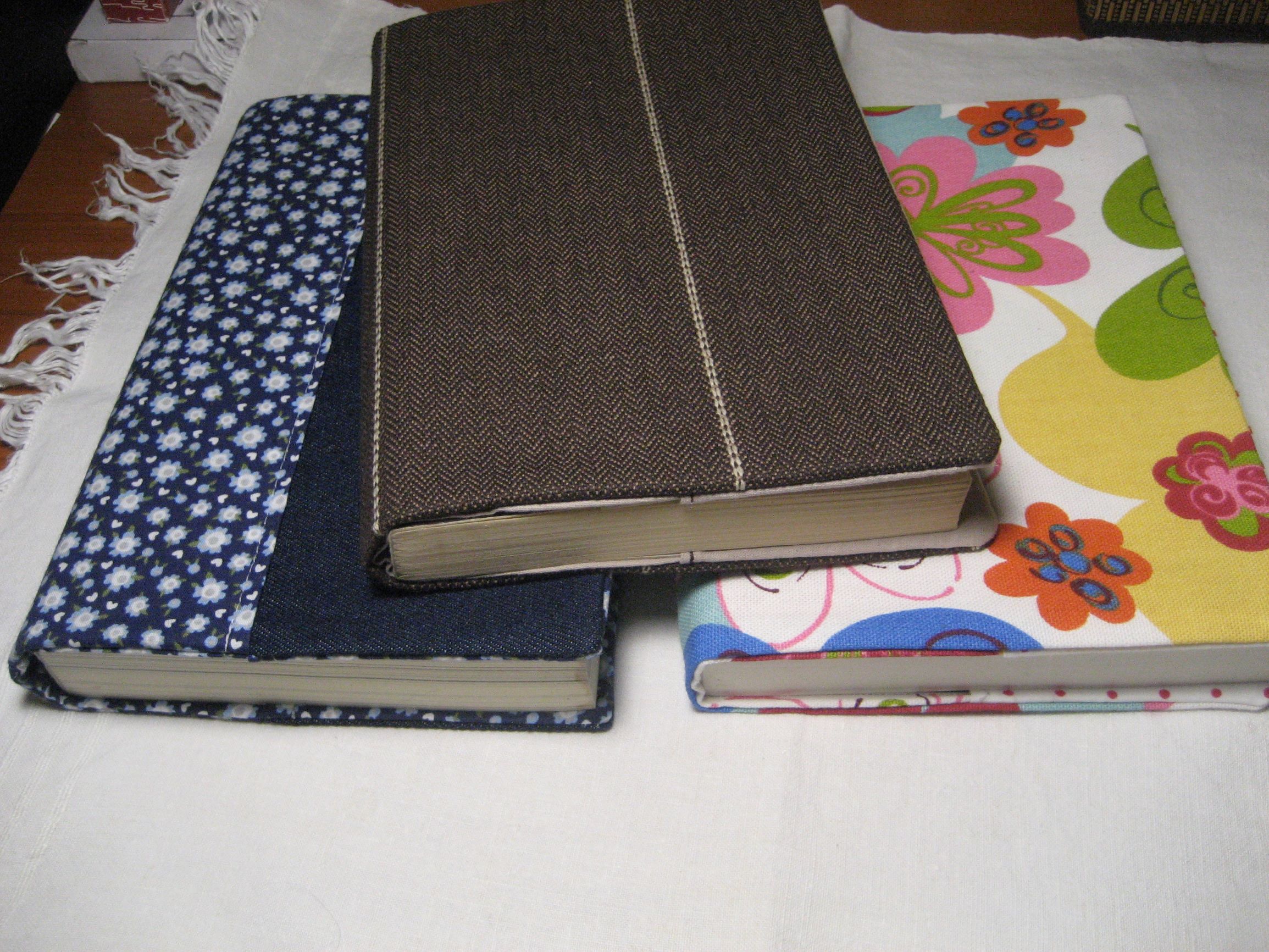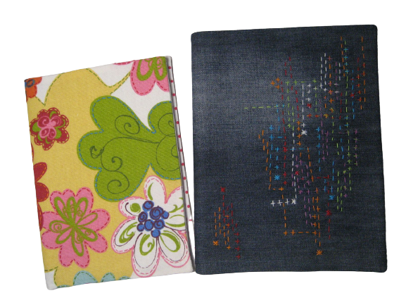Cadernos com capas em tecido feitas à mão por Suzana Nobre.