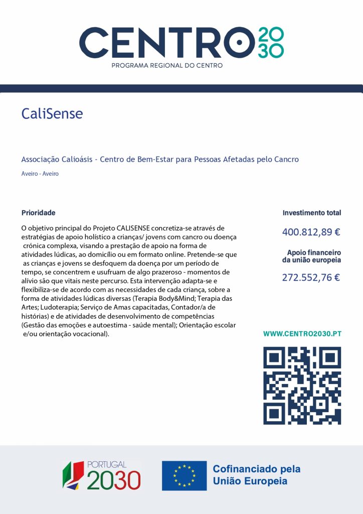 Projeto CaliSense foi aprovado e é cofinanciado pelo Programa Regional Centro 2030 da Estrutura de Missão Portugal Inovação Social e por investidores sociais. Desta forma, conseguimos proporcionar, a título gratuito, as atividades acima elencadas.